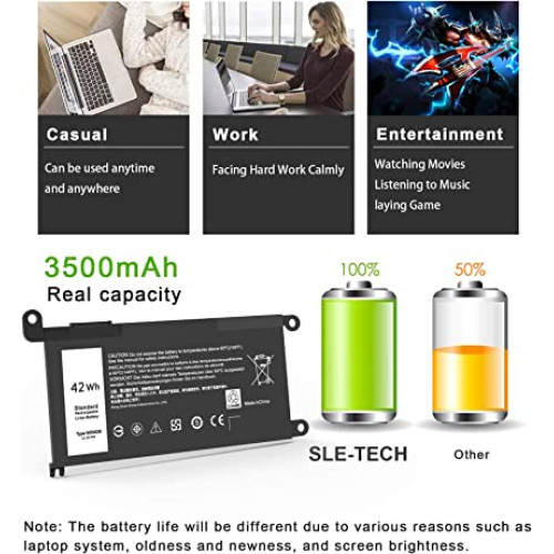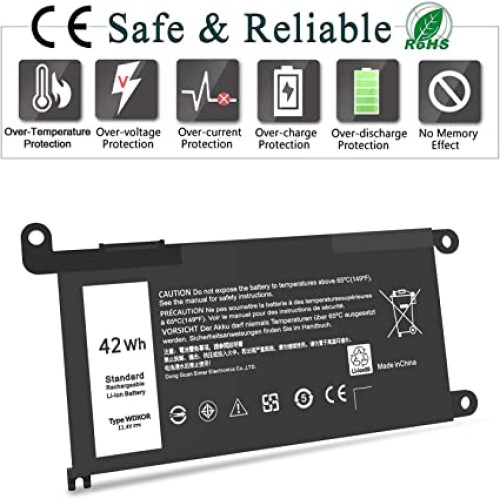 The Dell WDX0R Laptop Battery is a 3-cell Lithium-ion type battery that features a 42Wh capacity and 11.1V Voltage. This battery is compatible with Dell Inspiron 13 7368, 5378, 7378, 5368, 5379; Dell Inspiron 14-7460, 14 7472,15 5565, 5567, 5568, 5578, 7579, 7569, 7560, 7570, P58F, 17 5767, 5765; Latitude 3180, 3189, INS 13MF 15MF; Vostro 14 5468, 15 5568 Series. This laptop battery has 03 months warranty.