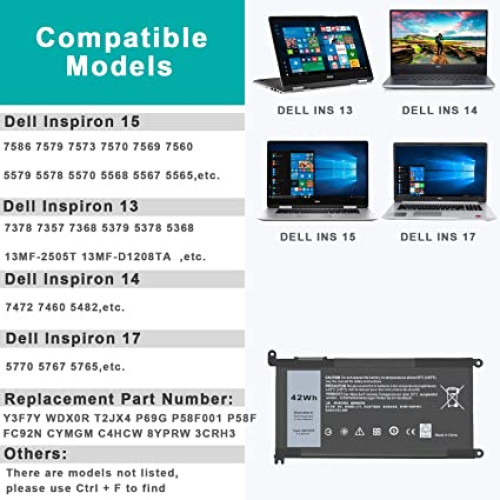 | Compatible Laptop Model | Dell Inspiron 13 7368, 5378, 7378, 5368, 5379; Dell Inspiron 14-7460, 14 7472,15 5565, 5567, 5568, 5578, 7579, 7569, 7560, 7570, P58F, 17 5767, 5765; Latitude 3180, 3189, INS 13MF 15MF; Vostro 14 5468, 15 5568 Series. | |
