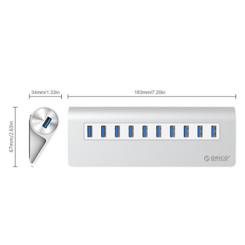 10 USB 3.0 ports are offered by ORICO M3H10-V1, for U-disk, keyboard, mouse, earphone, hard drive and other devices, complementing scarce port and protecting the original port. The USB 3.0 ports transfer data up to 5 Gbps, 10 times faster than USB2.0, setting aside more time to do what else user pfreferes; solid-state capacitor, PCB circuit and VIA controller make it more ideal for usage. Aluminum alloy chassis with Mac style is designed along anodic oxidation, perfectly matching with user's Ultrabook, Mac and large smartphone. 30°slope is easy to plug and use and convenient. This HUB is compatible with Windows / Linux / Mac OS / Android4.2 and etc; work with scanner, digital camera, card reader, U-disk, hard drive, WiFi, mouse, keyboard and other USB devices, no driver needed. Orico M3H10-V1 aldo owns built-in over voltage, over current, leakage and short circuit protection which keeps hub and attached devices safe.